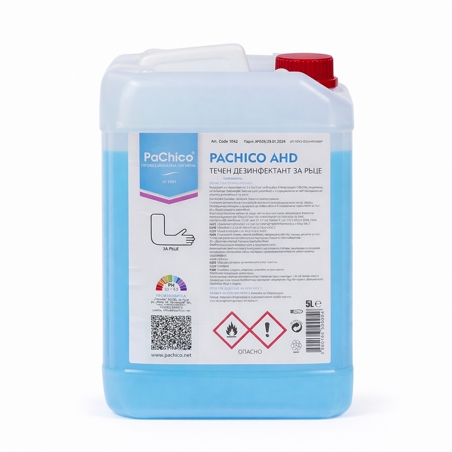 Pachico AHD е високоефективен алкохолен дезинфектант за ръце в 5-литрова опаковка, разработен за болници, здравни заведения, хранително-вкусова промишленост и други професионални среди с високи хигиенни изисквания.