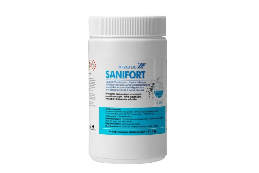 Санифорт таблетки са таблетна форма на хлорния дезинфектант SANIFORT. За разлика от хлорните гранули, таблетките осигуряват по-прецизна дозировка и по-лесна употреба при дезинфекция на вода и повърхности.