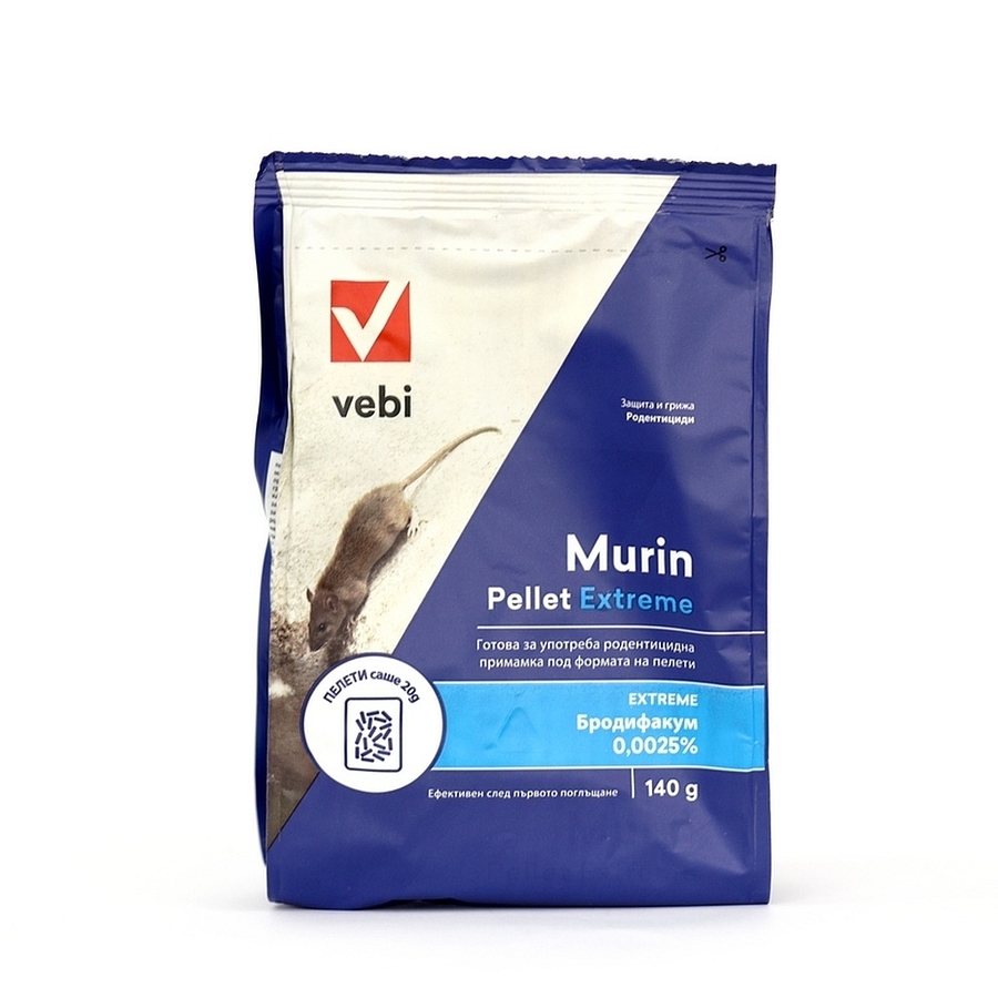 Murin Pellet Extreme 140 г е готова за употреба родентицидна примамка под формата на пелети, предназначена за контрол на домашна мишка (Mus musculus) и сив плъх (Rattus norvegicus). Може да се използва вътре в сгради и около тях (до 0,5 m от стените). Продуктът е подходящ за масова употреба, тъй като опаковката е 140 g — под лимита до 150 g за непрофесионални потребители.