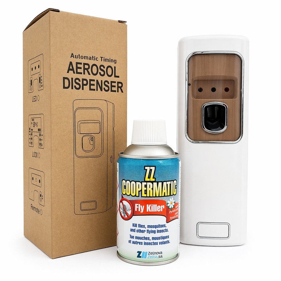 Новият ZZ Coopermatic Fly Killer е стилен и ефективен автоматичен диспенсър, създаден за постоянен контрол на летящи насекоми в натоварени и рискови зони.